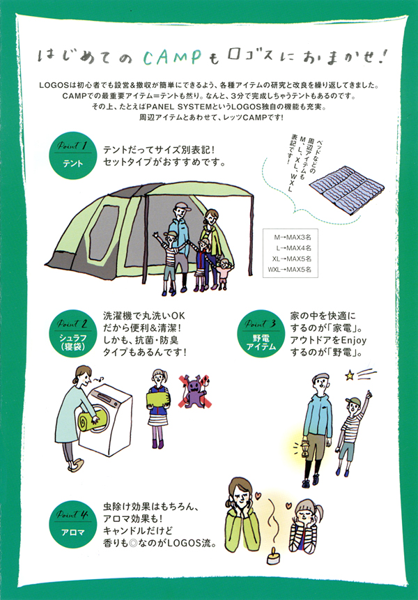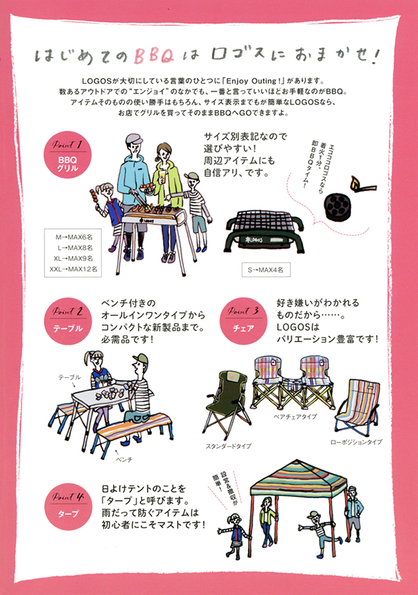 アウトドアブランドLOGOSのカタログ『はじめてのBBQ & CAMPカタログ』のイラストを描きました。