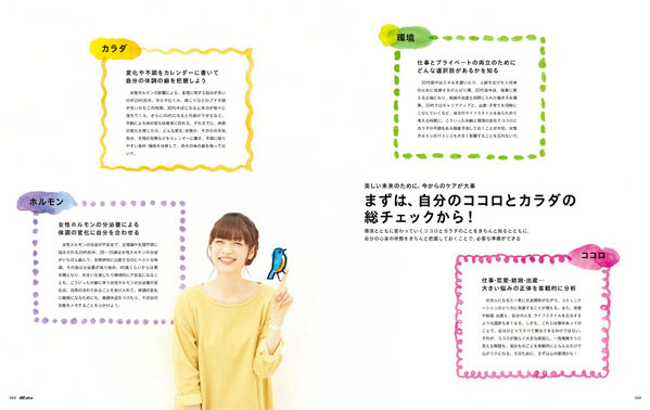 「心地いい、気持ちいい ココロとカラダ」特集の扉イラストをはじめ、枠線や模様、人物など20点ほど描きました。